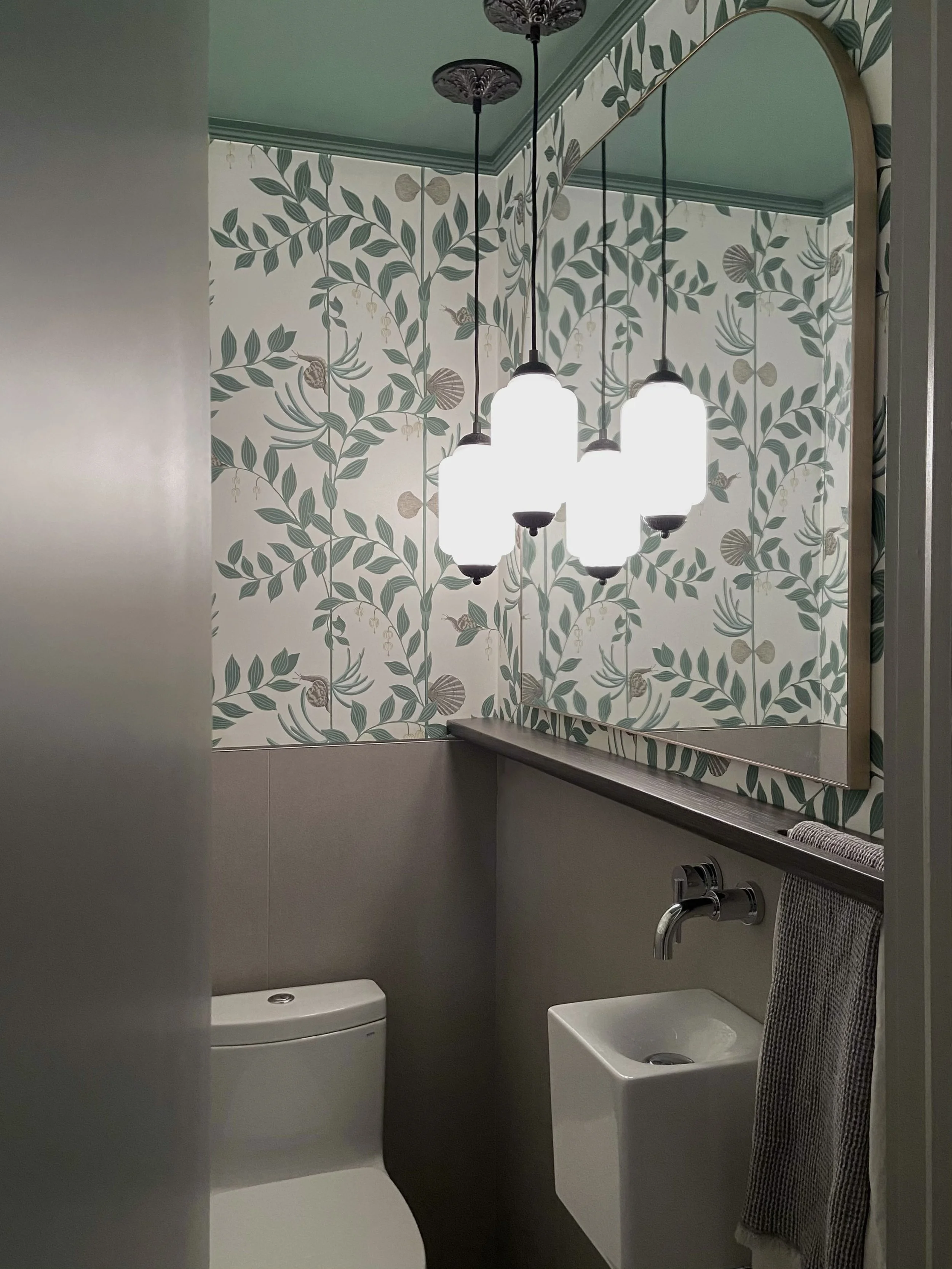 We transformed a compact 3’x5’ powder room into a hidden jewel, blending charming botanical wallpaper with earthy tones for a refreshing yet sophisticated feel. Every detail, from the custom floating shelves to the sleek, minimalist fixtures, was masterfully tailored to elevate the room’s small footprint.